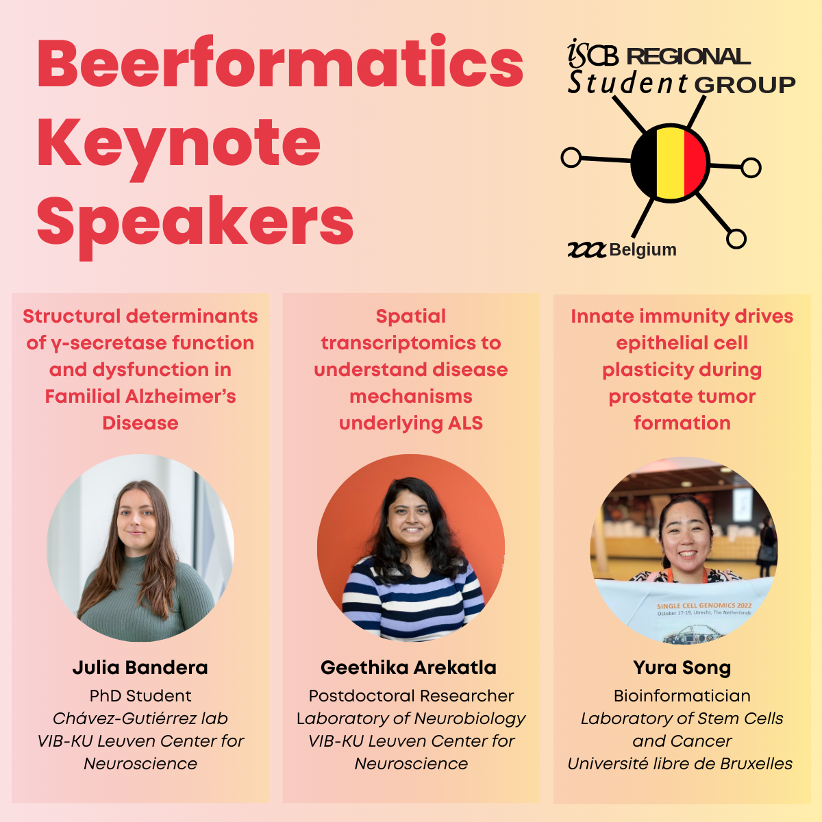 We are excited to welcome three speakers who will present their latest research spanning cancer biology, spatial transcriptomics, and neurodegeneration.